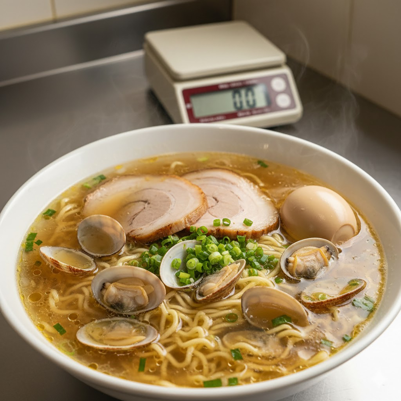 - あさり塩ラーメン(400円) 新メニューながら、すでに店の顔となりつつある一杯。そのレシピは、酒(10g)、藻塩(2.2g)、黒コショウ(0.1g未満)、ショウガ(1g)、ガーリックバターオイル(0.5g)、うま味調味料(0.2g)をお湯(190g)で溶き、仕上げにあさり(20g)を乗せるという、まさに科学実験のような精密さで完成されます。このこだわりで400円という価格は驚きです。