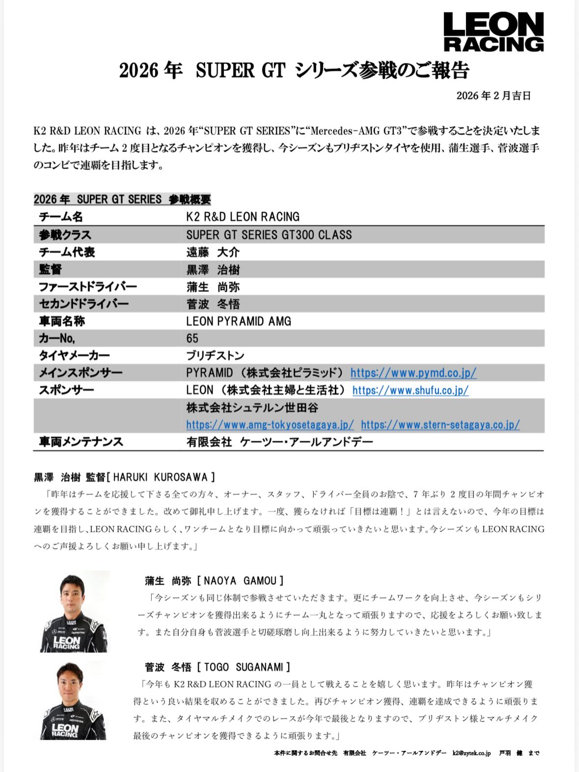 昨シーズン、蒲生尚弥選手と菅波冬悟選手のコンビで頂点に立った65号車。黒澤治樹監督のもと、2026年もこの最強パッケージを継続します。